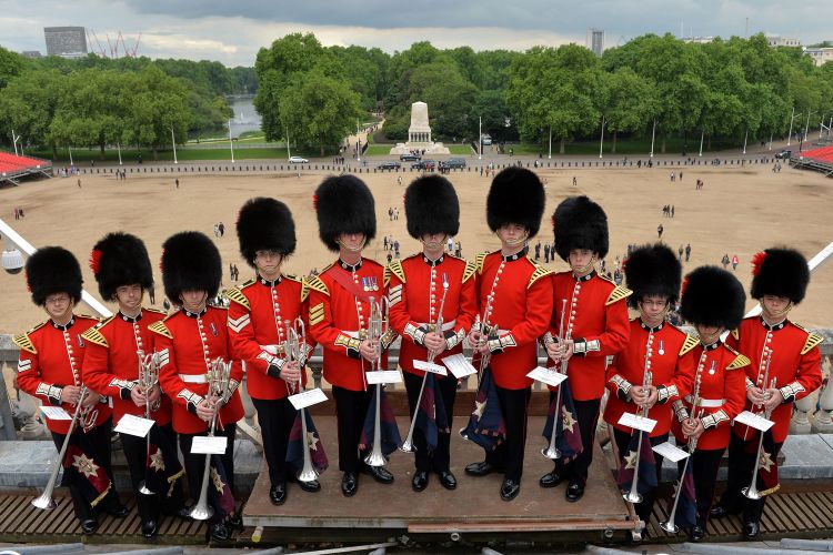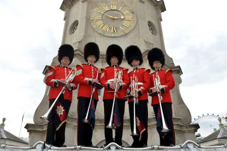 Musicians from the Band of the Irish Guards, positioned on the roof of the historic Horse Guards building, and dressed in their finest State Ceremonial uniform, played a selection of music from the sunset musical spectacular.