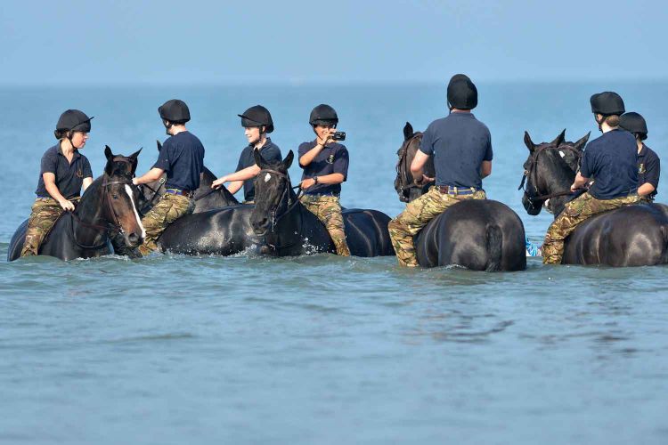 The visit is a vital military and equestrian training exercise which is impossible to deliver in the confines of a London-based barracks. Beach work may look like fun; but it is an essential part of the never-ending work to build trust and confidence between horse and rider.