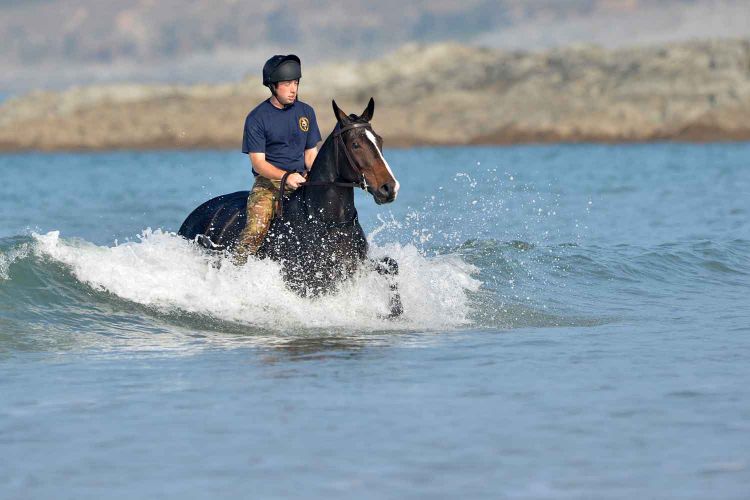 Not all horses have the confidence to go into the churning surf, especially when the ground beneath their hooves shifts and sinks. But by trusting their rider and overcoming their fears, the bond between the two is made stronger; vital for dealing with the unpredictable during high-profile ceremonial duties back in London.