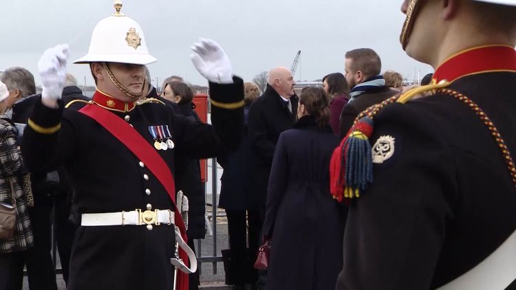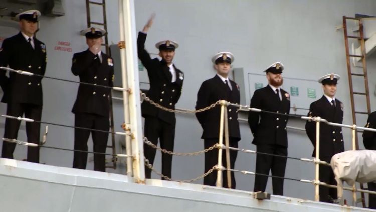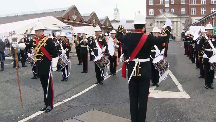 The ship's crew were welcomed home by the Royal Marines Band Service