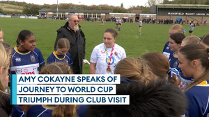 RAF player and World Cup winner Flight Lieutenant Amy Cokayne speaks to BFBS Sport alongside her father Ian as the star player meets with young players at Mansfield Rugby Club